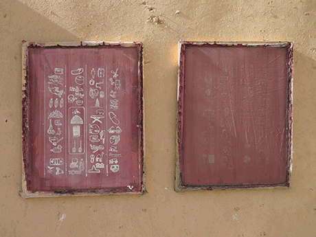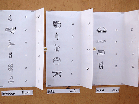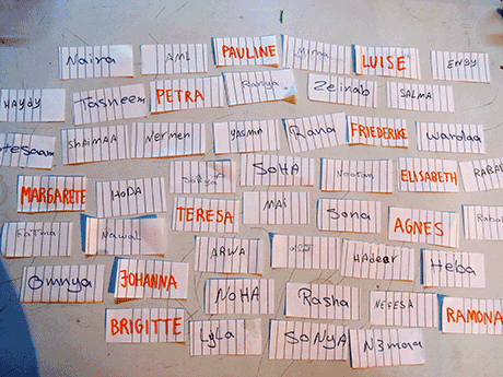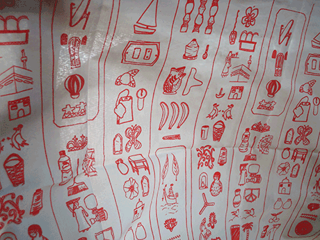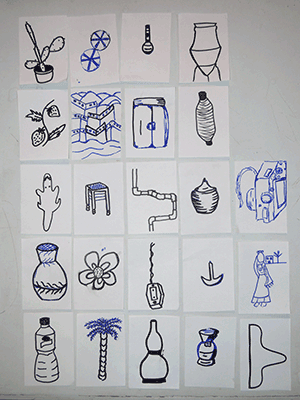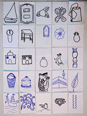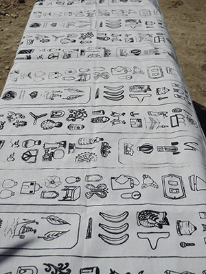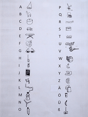 My approach was, that the participants created a screen printing pattern by composing a modern hieroglyph alphabet out of drawings of every day objects that they found in the area.