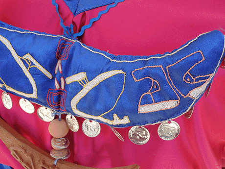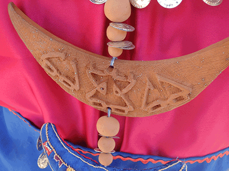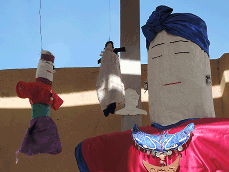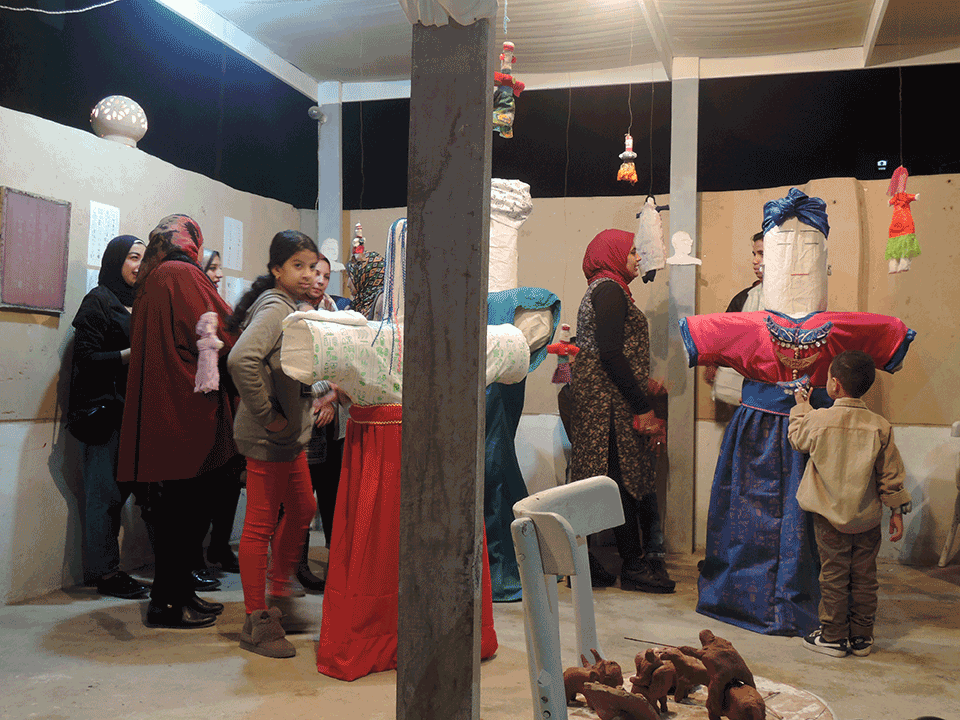 We built big puppets from wood, foam and fabric, that were inspired by traditional rug puppets ("Qurna puppets"), made up names for them and dressed them with the printed fabrics.