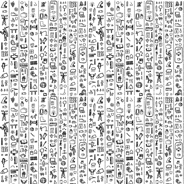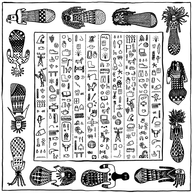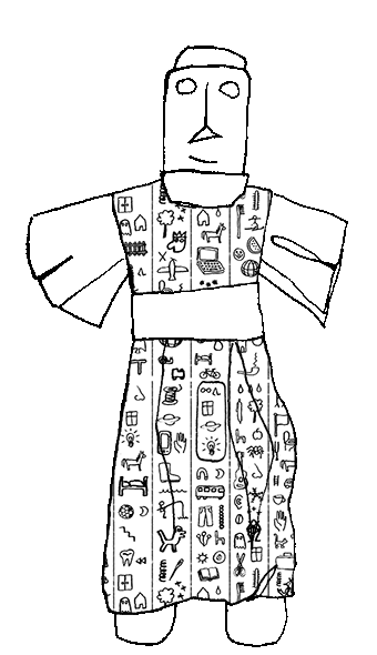 Ich fand Bilder von alten "Paddelpuppen", die in der Gegend als Spielzeug oder rituelle Plastiken hergestellt wurden. Ich war sehr fasziniert von ihnen, also machte ich einige Zeichnungen, die am Ende nicht verwendet wurden. Außerdem fertigte ich Zeichnungen von möglichen "modernen Hieroglyphen" und einem Bandana an, das die beiden Themen kombinierte.