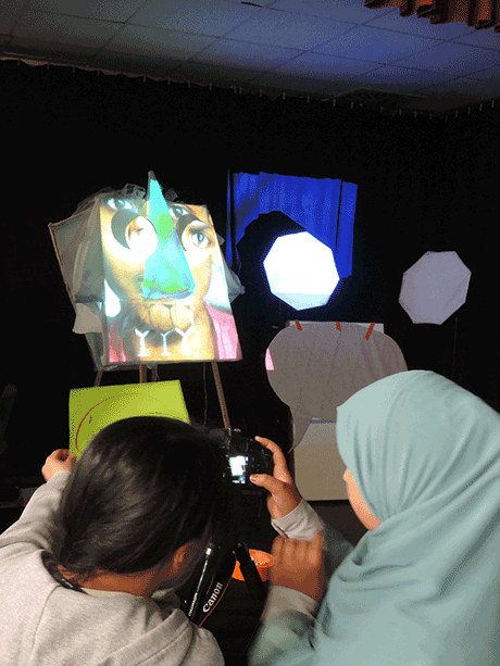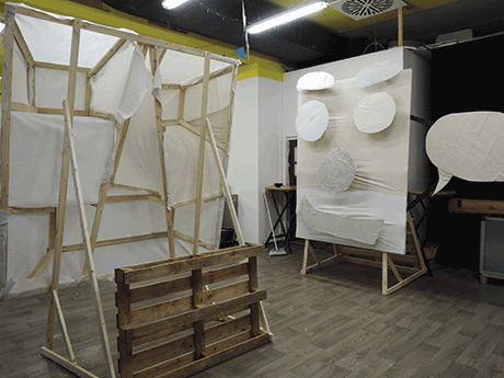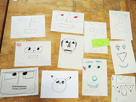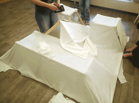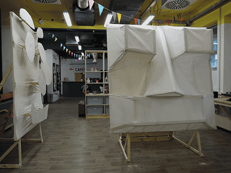Together with two groups of children we worked out different forms of faces, elected one face per group and built it big out of wood and white textile.