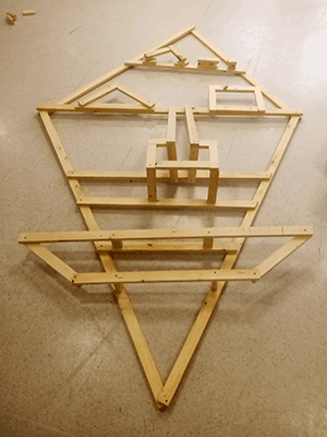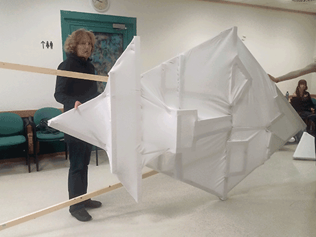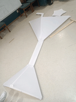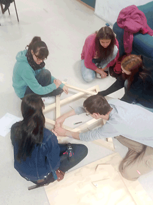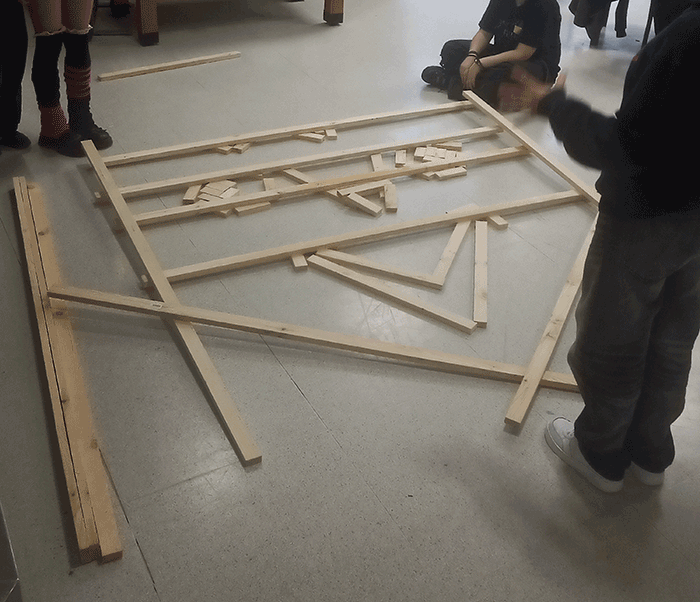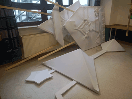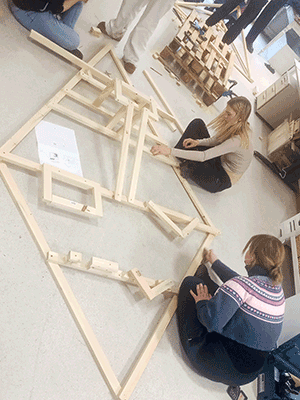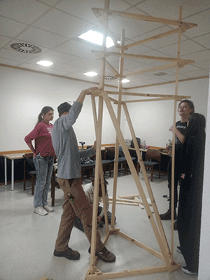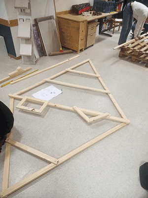Together with four groups of youngsters we worked out different shapes, elected one per group and built it big out of wood and white textile.