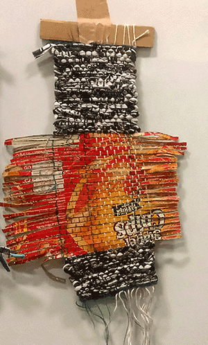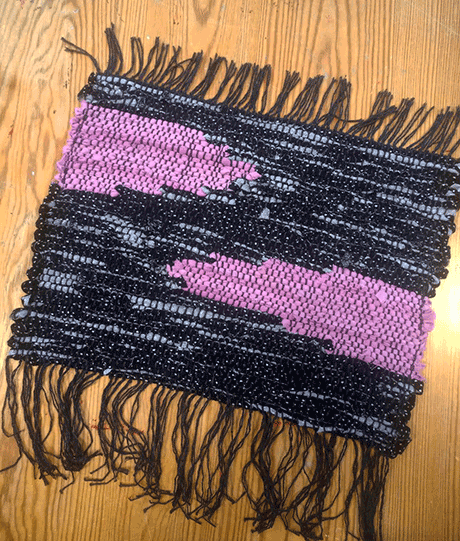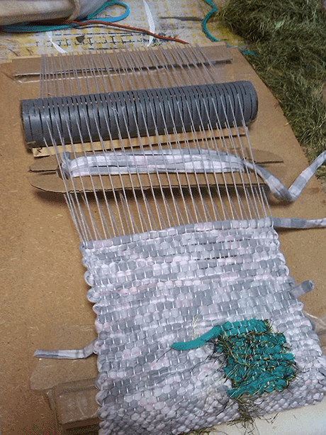 Ich erfuhr von der großartigen Erfindung von Matteo Salusso, der mit Rohren Webrahmen baut. Also baute ich selbst etwas ähnliches und webe seitdem ab und zu kleine Teppiche darauf.