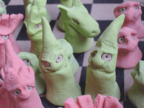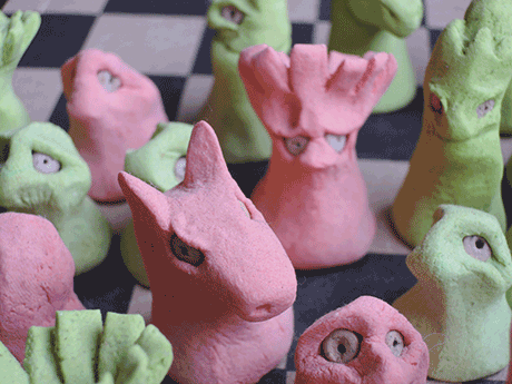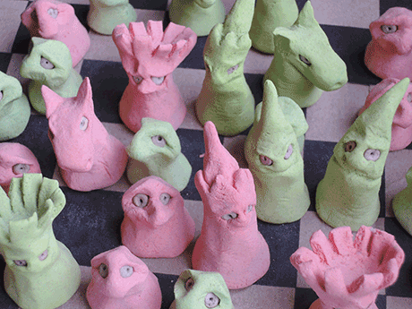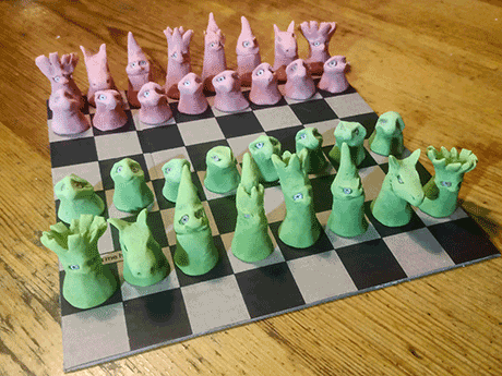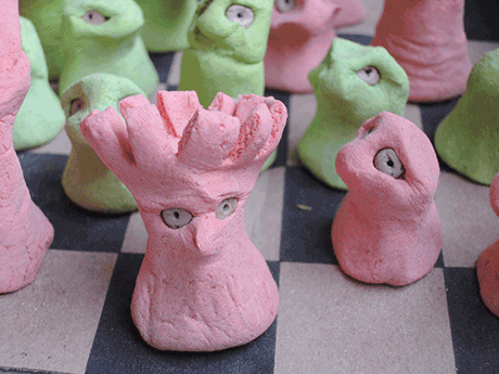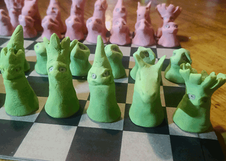 Eines Tages fand ich eine Pappschachtel mit einem Schachbrettmuster und langweilte mich, also machte ich Schachfiguren aus Salzteig.