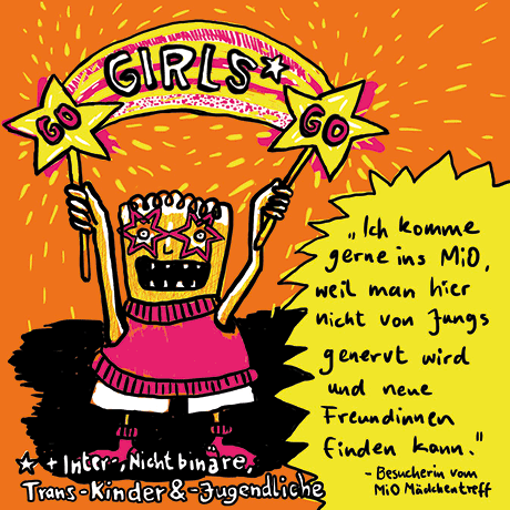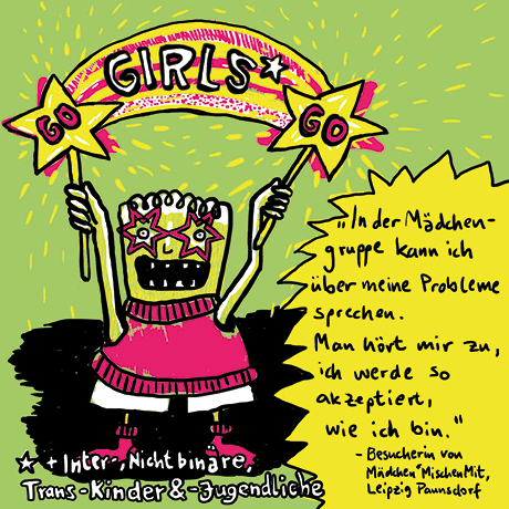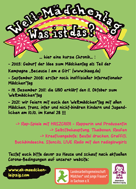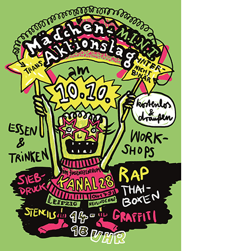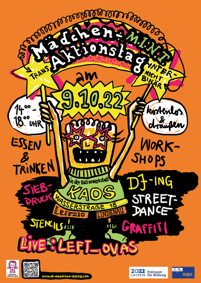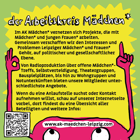 Die Veranstaltung ist für Mädchen und Flinta- (weiblich, lesbisch, intersexuell, nicht-binär, trans und agender) Kinder und -Jugendliche. Ich war Teil des Arbeitskreises, der sich mit Themen von und Angeboten für Mädchen* beschäftigt.