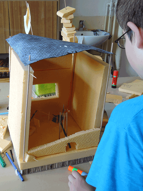 I gave the students different crafting material to build models for possible sculptures in their yard, that you could generate sounds with.