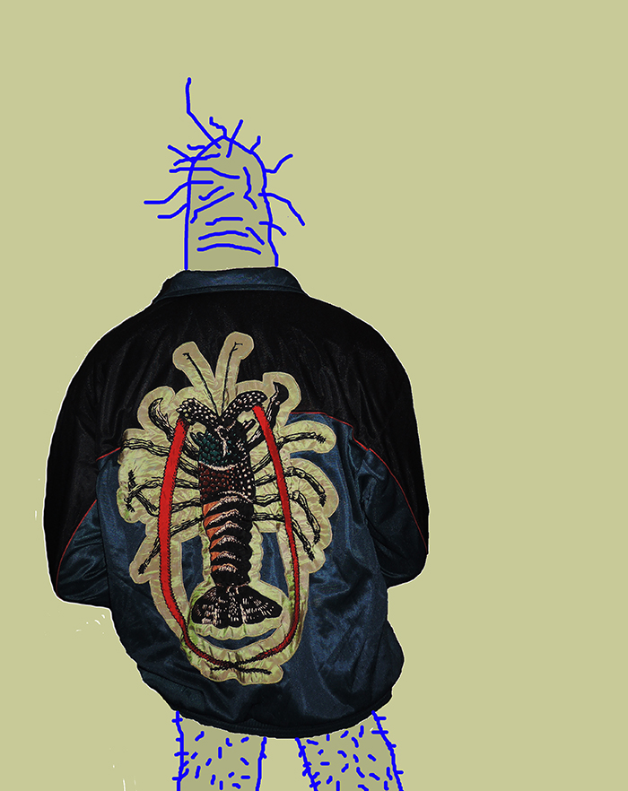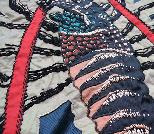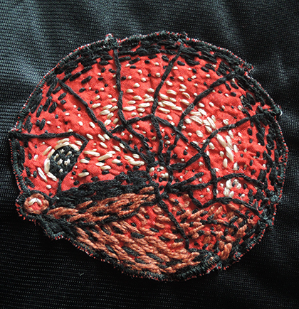 Diese Stickerei eines Flusskrebses fertigte ich als Geschenk an. Ich nähte ihn auf eine Blouson-Jacke.