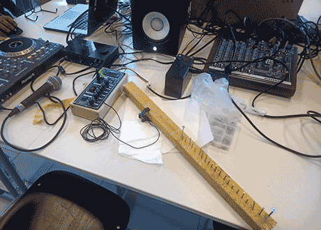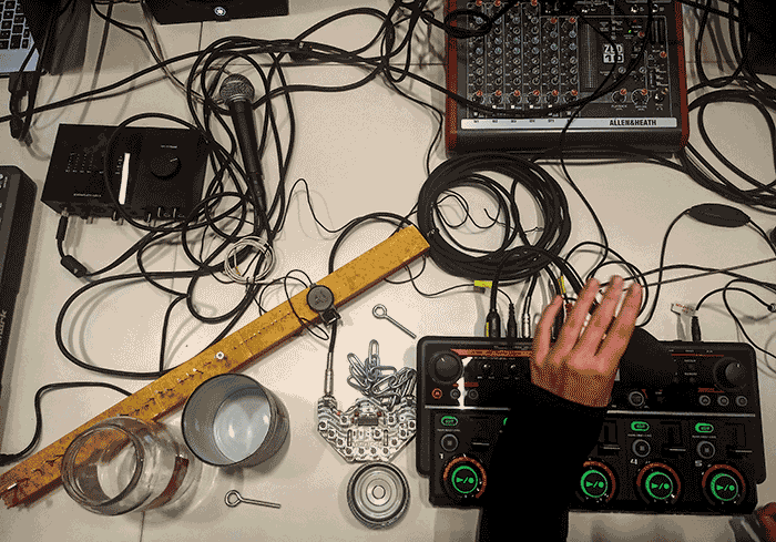 It also involved (apart from nails, wood, metal and a contact microphone): the space ship shaped synthie with 10 oscillators - an invention of noisio.