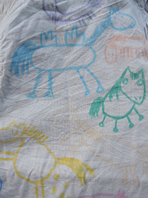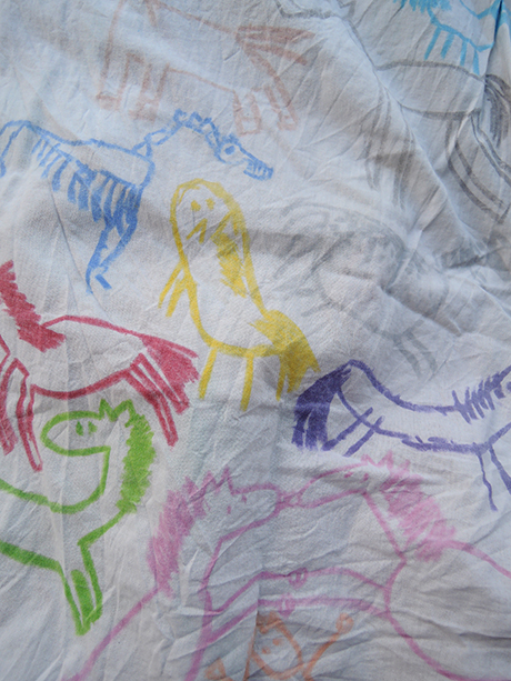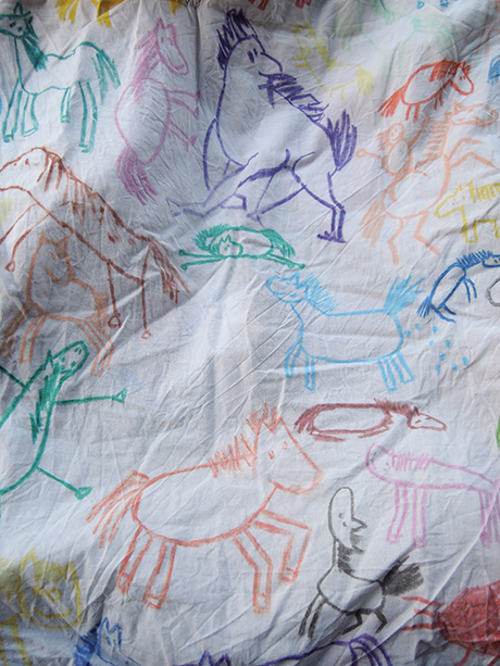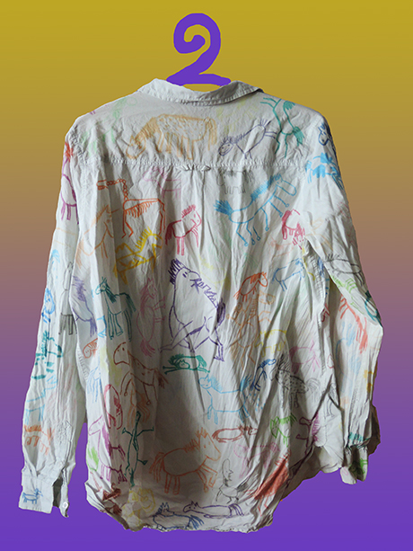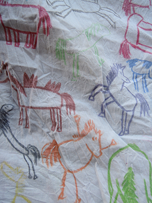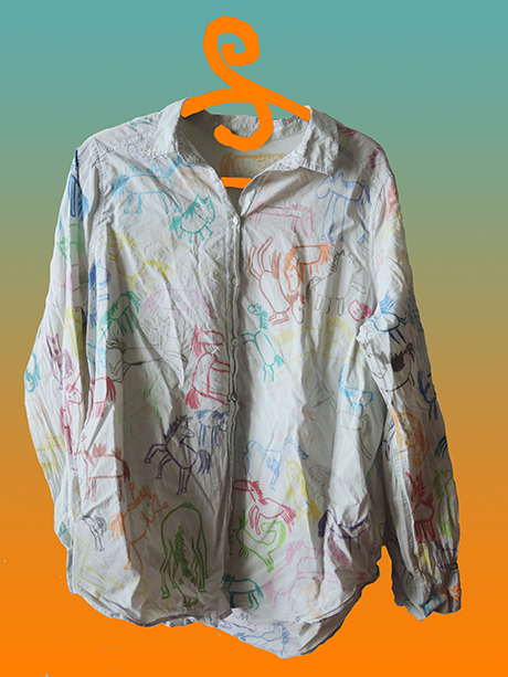 Ich habe herausgefunden, dass Pferde einem weißen Hemd viel Leben einhauchen. Gezeichnet habe ich sie mit Wachsmalstiften.