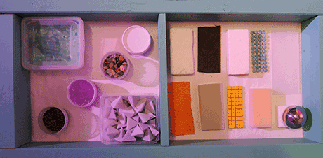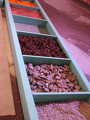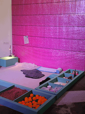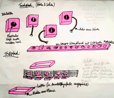 Another part of the installation was a "tactile corner", consisting of a barefoot path over stones, wood and other materials and many material pieces for touching.